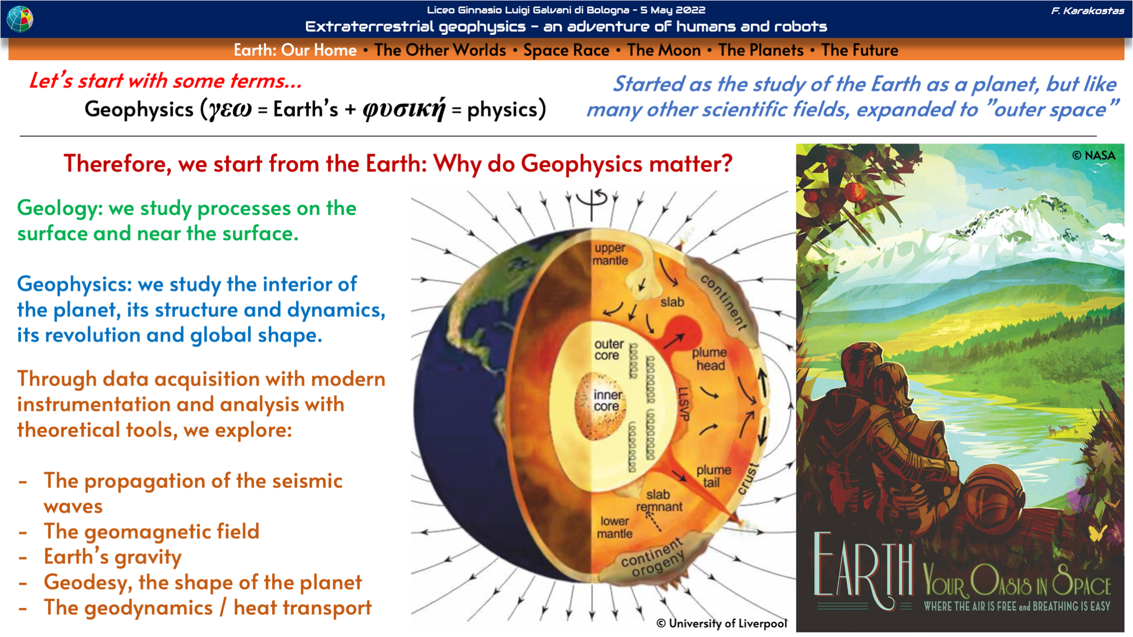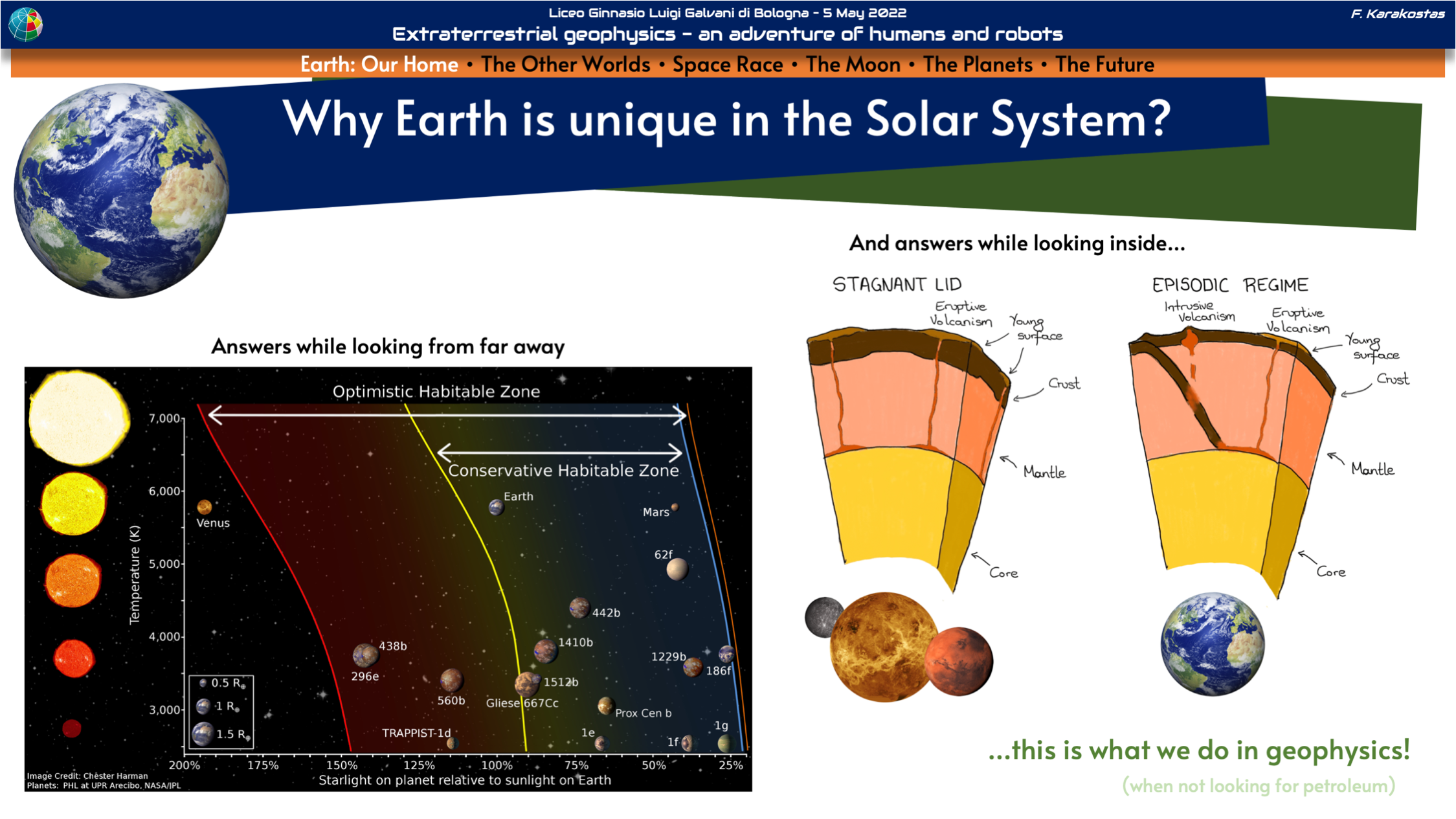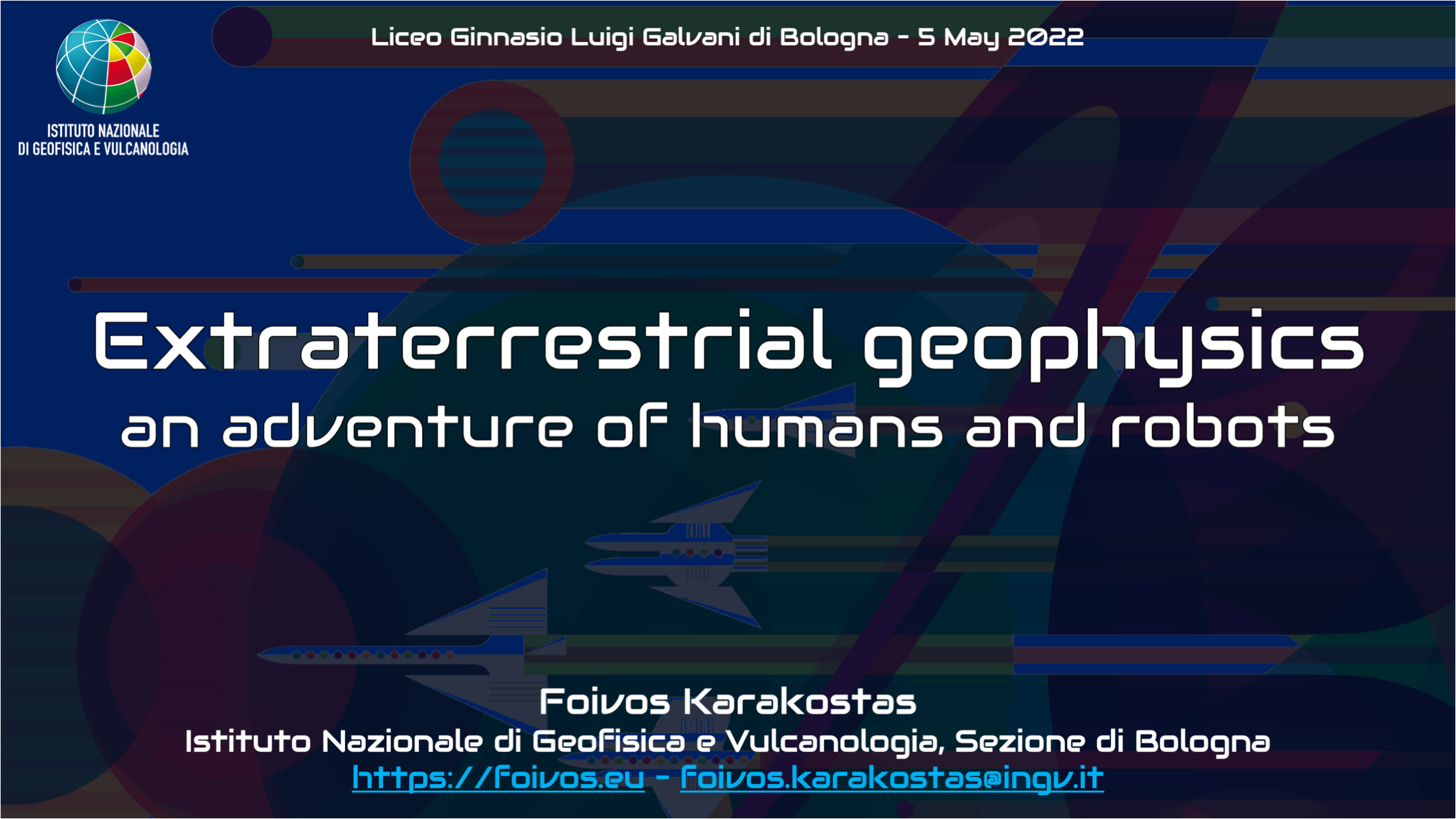 On May 5, 2022, I was invited by Dr. Maria Michail, to give a lecture on Extraterrestrial Geophysics to the students of the senior year of the “Liceo Galvani” high school in Bologna. The slides of my presentation are available here.