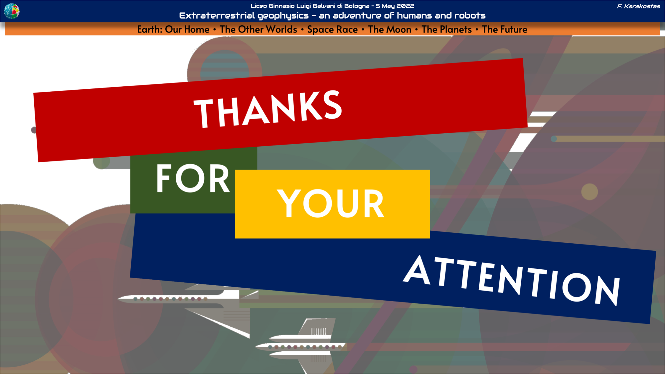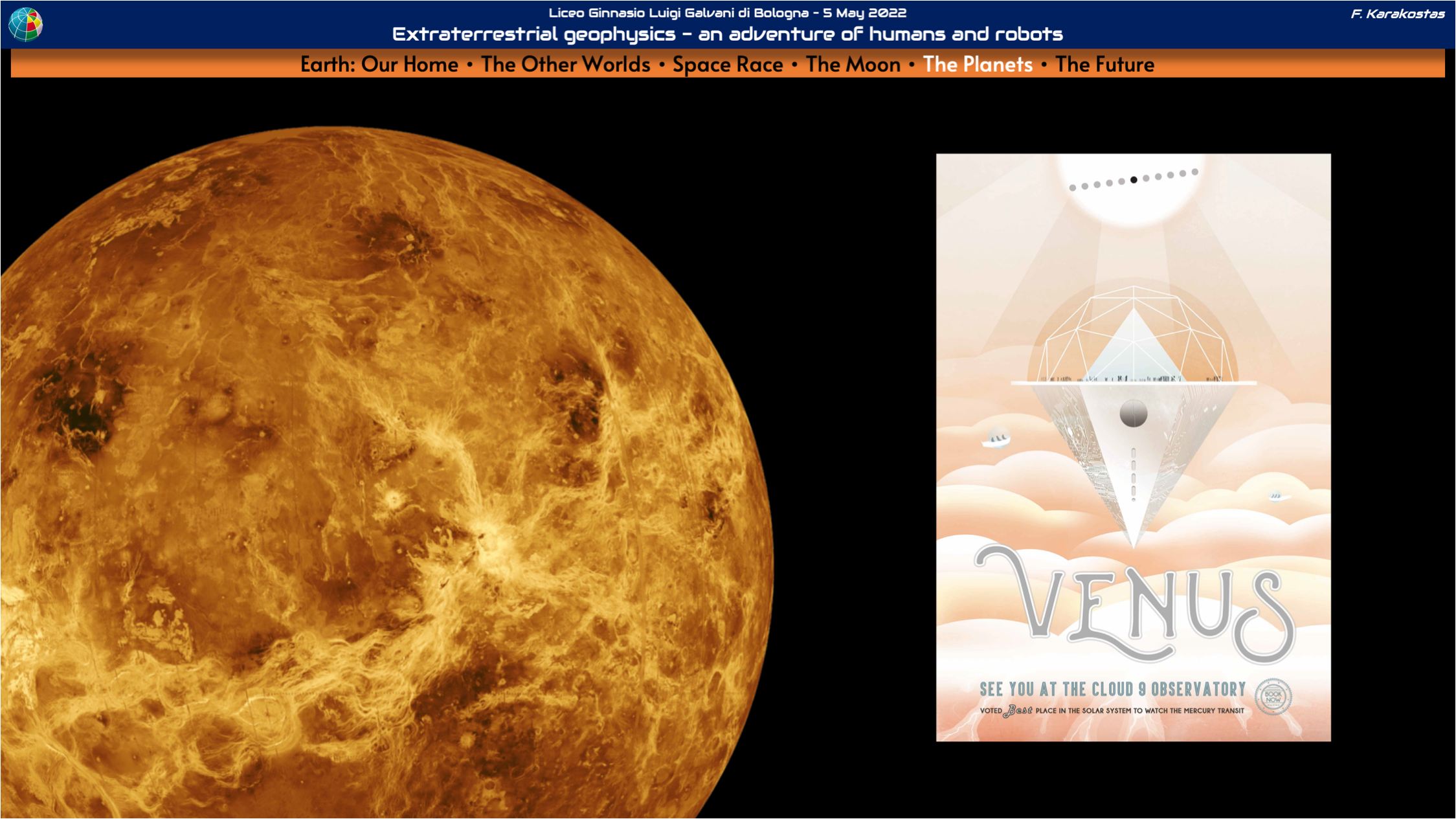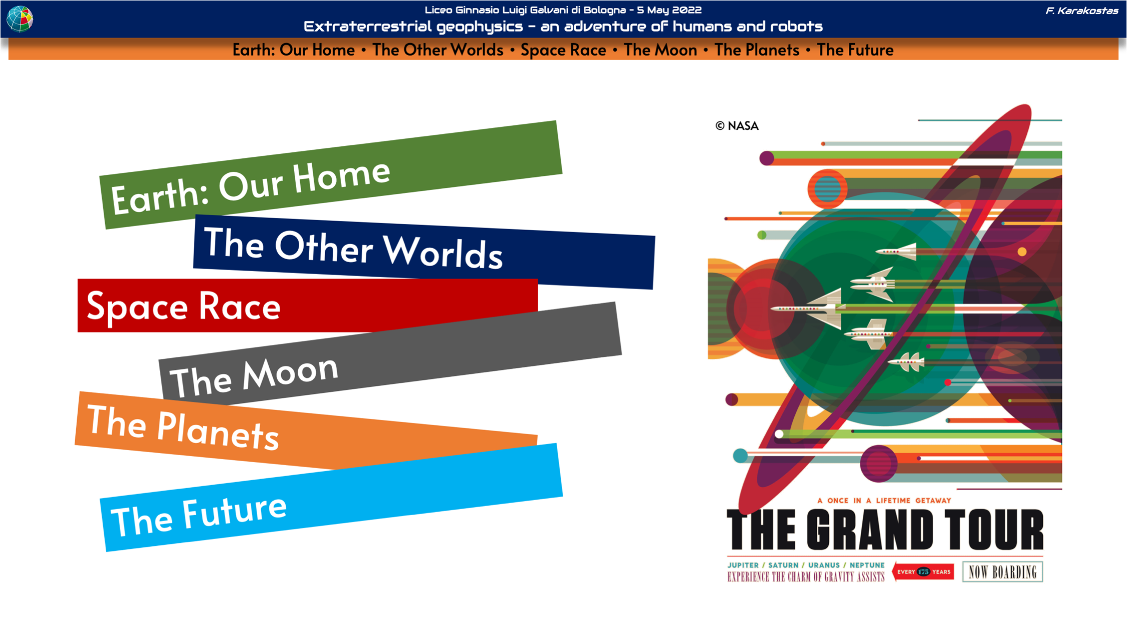 On May 5, 2022, I was invited by Dr. Maria Michail, to give a lecture on Extraterrestrial Geophysics to the students of the senior year of the “Liceo Galvani” high school in Bologna. The slides of my presentation are available here.